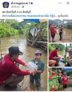 ผกก.สภ.ป่าโมก พร้อมกำลังเจ้าหน้าที่ตำรวจ สภ.ป่าโมก และจิตอาสา เดินทางด้วยเรือไปยัง บ้านสวนยายส้ม หมู่ 4 ตำบลโผงเผง อำเภอป่าโมก จังหวัดอ่างทอง เพื่อมอบอาหารกลางวัน ไข่ไก่ และน้ำดื่มให้แก่ประชาชนที่ได้รับผลกระทบจากอุทกภัย จำนวน 900 กล่อง2.) สภ.อินทร์บุรี ภ.จว.สิงห์บุรี