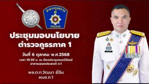 เมื่อวันที่ 16 ตุลาคม 2568 พล.ต.ท.วัฒนา ยี่จีน ผบช.ภ.1 ชูนโยบายการทำงานของตำรวจภูธรภาค 1 เพื่อประชาชนคือ…….”ยุติธรรม มีวินัย โปร่งใส เป็นที่พึ่งของประชาชน”