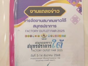 เมื่อวันพุธที่ 22 ตุลาคม 2568 เวลา 13.00 น. ที่ห้องอาหาร “บ้านเกาะยอ” ถนนสุขุมวิทสายเก่า ตำบลท้ายบ้านใหม่ อำเภอเมือง จังหวัดสมุทรปราการ นายไพรัตน์ จันทร์ไชยแก้ว นายกสมาคมชาวใต้สมุทรปราการ พร้อมด้วยนายชาญณรงค์ รมย์ทอง รองประธานสมาคม และคณะกรรมการบริหาร จัดงานแถลงข่าวการจัด “FACTORY OUTLET FAIR 2025” ซึ่งจะจัดขึ้นระหว่างวันที่ 5–14 ธันวาคม 2568 เวลา 18.00–24.00 น. ณ ลานอเนกประสงค์ตรงข้ามเยื้องหมู่บ้านพฤกษา 106 บางปู