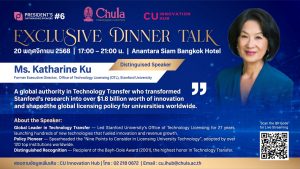 จุฬาลงกรณ์มหาวิทยาลัยขอเชิญชวนบุคคลทั่วไป ผู้สนใจด้านนวัตกรรม และบุคลากรในระบบนิเวศธุรกิจนวัตกรรม เข้าร่วมรับชมการถ่ายทอดสด (Live Streaming) งาน “President’s Distinguished Speaker” ครั้งที่ 6