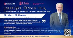 อีกหนึ่งท่านคือ Mr. Marco M. Alemán ผู้ช่วยอธิบดี องค์การทรัพย์สินทางปัญญาโลก (WIPO) ผู้ขับเคลื่อนพันธกิจหลักของ WIPO ในการเปลี่ยน “ทรัพย์สินทางปัญญา (Intellectual Property: IP)” ให้เป็นพลังขับเคลื่อนนวัตกรรมและการเติบโตทางเศรษฐกิจอย่างยั่งยืน ด้วยประสบการณ์กว่า 20 ปีในการกำหนดนโยบายและขับเคลื่อนระบบนิเวศนวัตกรรมและทรัพย์สินทางปัญญาในระดับประเทศทั่วโลก