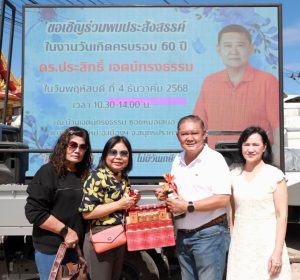 วันที่ 4 ธันวาคม 2568 ที่หน้าบ้านเจตน์ทรงธรรม ภายในซอยหมอเสนอ ต.บางเมืองใหม่ อ.เมือง จ.สมุทรปราการ ดร.ประสิทธิ์ เจตน์ทรงธรรม หรือเฮียประสิทธิ์ นายกสมาคมผู้ผลิตน้ำดื่มจังหวัดสมุทรปราการ และกรรมการผู้จัดการ บริษัทเอเซีย วอเตอร์มาร์ท จำกัด ได้จัดงานวันเกิดครบรอบ 60 ปี โดยมีเพื่อนพ้องน้องพี่ที่รักใคร่ร่วมนำอาหารเครื่องดื่มต่างๆจากร้านค้าชื่อดังมาออกซุ้มบริการแขกที่มาร่วมงาน