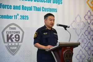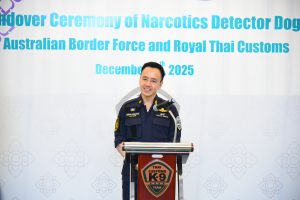 วันที่ 11 ธันวาคม 2568 เวลา 12.30 น. นายพันธ์ทอง ลอยกุลนันท์ อธิบดีกรมศุลกากร เป็นประธานในการรับมอบสุนัขตรวจค้นยาเสพติด จำนวน 3 ตัว จากสำนักงานพิทักษ์เขตแดนแห่งออสเตรเลีย (The Australian Border Force: ABF) ได้แก่ Pixel, Wafer และ Walshy เพื่อสนับสนุนภารกิจด้านการป้องกัน