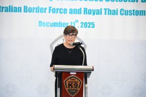 แห่งออสเตรเลีย (The Australian Border Force: ABF) ได้แก่ Pixel Wafer และ Walshy โดยได้รับเกียรติจาก H.E. Dr. Angela Jane Macdonald เอกอัครราชทูตออสเตรเลีย ประจำประเทศไทย, Superintendent James Ryanและเจ้าหน้าที่จาก ABF เข้าร่วมพิธี ซึ่งการมอบสุนัขตรวจค้นในครั้งนี้ เป็นความร่วมมือระหว่างกรมศุลกากรและสำนักงานพิทักษ์เขตแดนแห่งออสเตรเลีย ภายใต้โครงการ ABF – Thai Customs Detector Dog Cooperation 2024–2027 ซึ่งเป็นความร่วมมือด้านการพัฒนาศักยภาพ ความเชี่ยวชาญ องค์ความรู้ ทักษะ และเทคนิคต่าง ๆ ให้แก่ทีมสุนัขตรวจค้นของกรมศุลกากรในการร่วมปฏิบัติภารกิจด้านการสืบสวนและปราบปรามให้มีมาตรฐานระดับสากล