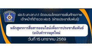 วันที่ 15 ม.ค. 69 เวลา 13.00 น. พล.ต.ต.ภัคพงศ์ สายอุบล ผบก.อก.ภ.1 ประธานพิธีเปิดโครงการอบรมเพิ่มศักยภาพเจ้าหน้าที่ตำรวจฝ่ายอำนวยการ 5 (ฝ่ายประชาสัมพันธ์)