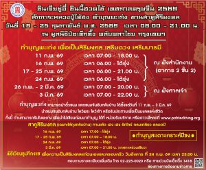 ซินเจียยู่อี่ ซินนี้ฮวดไช้.. ศาลเจ้าไต้ฮงกง มูลนิธิป่อเต็กตึ๊ง จัดงานเทศกาลตรุษจีนสุดยิ่งใหญ่ สักการะหลวงปู่ไต้ฮง (องค์ไต้ฮงกง) ลงชื่อสวดชัยมงคลคาถา (พะเก่ง) หนึ่งปีมีครั้งเดียว! เฮง เฮง เฮง ตลอดปีม้าทอง ระหว่างวันที่ 16 – 25 กุมภาพันธ์ พ.ศ. 2569 มูลนิธิป่อเต็กตึ๊ง