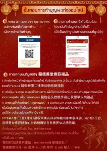 โดย นายวิเชียร เตชะไพบูลย์ ประธานกรรมการ ขอเชิญศิษยานุศิษย์ และสาธุชนทุกท่าน ร่วม “สักการะหลวงปู่ไต้ฮง” ขอพรเนื่องในเทศกาลตรุษจีน ลงชื่อ สวดชัยมงคลคาถา หรือ “พะเก่ง” เพื่อความเป็นสิริมงคลตลอดปี เป็นพิธีมหามงคลใหญ่ 1 ปีมีเพียงครั้งเดียว ที่เปิดให้ทุกท่านได้เลือกทำบุญพะเก่งๆ ละ 20 บาทตามแต่ประสงค์ ประกอบด้วย ขอให้ครอบครัวมีสุข (แกหมึ่งเก่ง) , สะเดาะเคราะห์ (ปออุ่งเก่ง) , เสริมโชคลาภ (คิ่วไฉ่เก่ง) , เสริมดวงชะตา (ส่วยกุงเก่ง) , เสริมความมั่นคงสถาพร (กึงกีเก่ง)